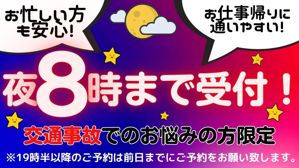 さらに、交通事故施術は夜20時まで対応しておりますので、お仕事帰りに通院したい方もお気軽にご相談ください。