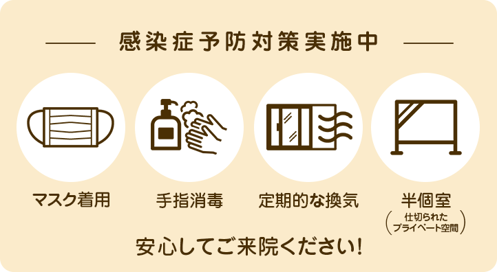 院内では定期的な換気を行っており、半個室のスペースもご用意しております。周囲を気にせず、落ち着いて施術を受けていただける環境づくりを心がけています。
